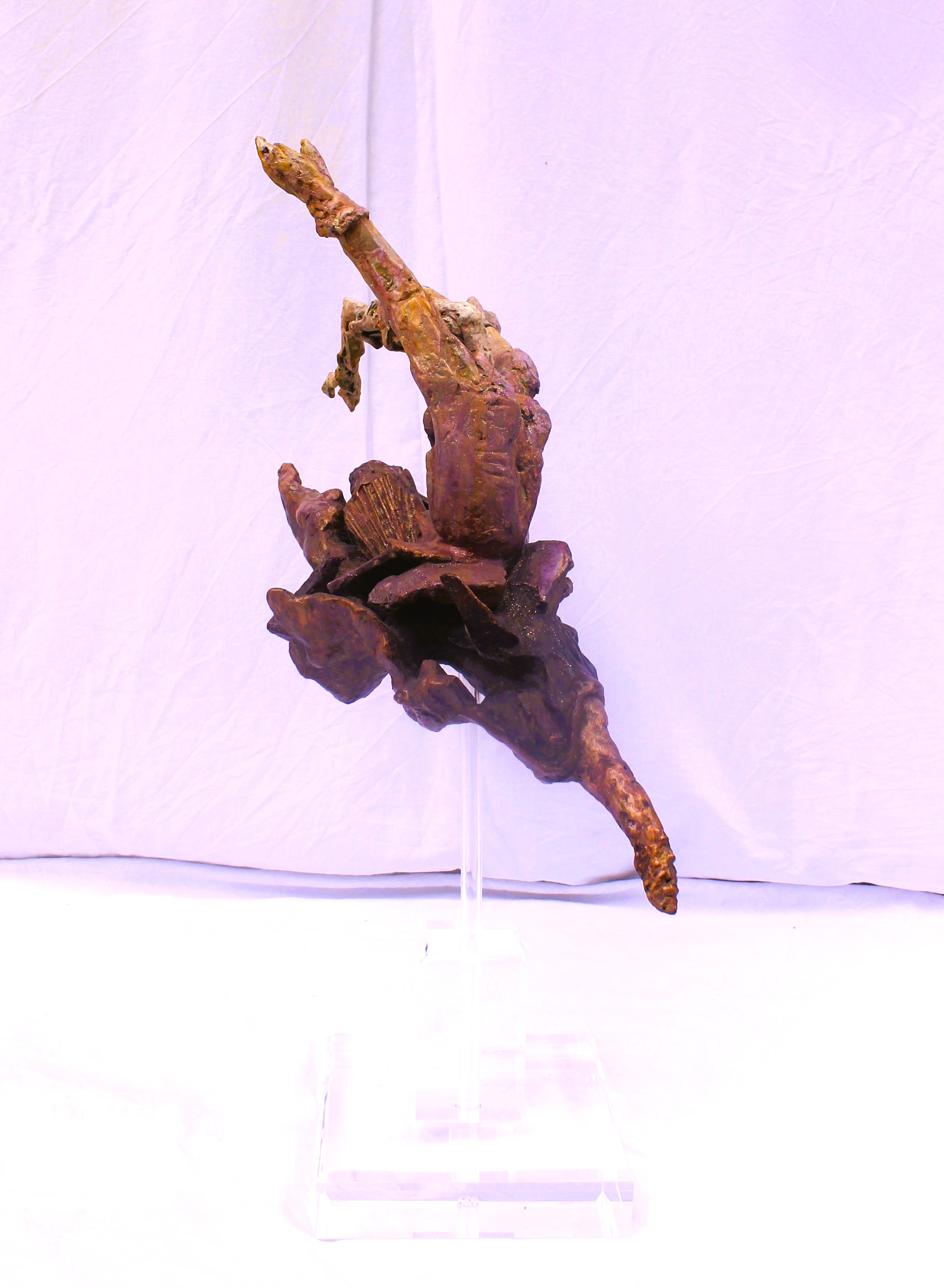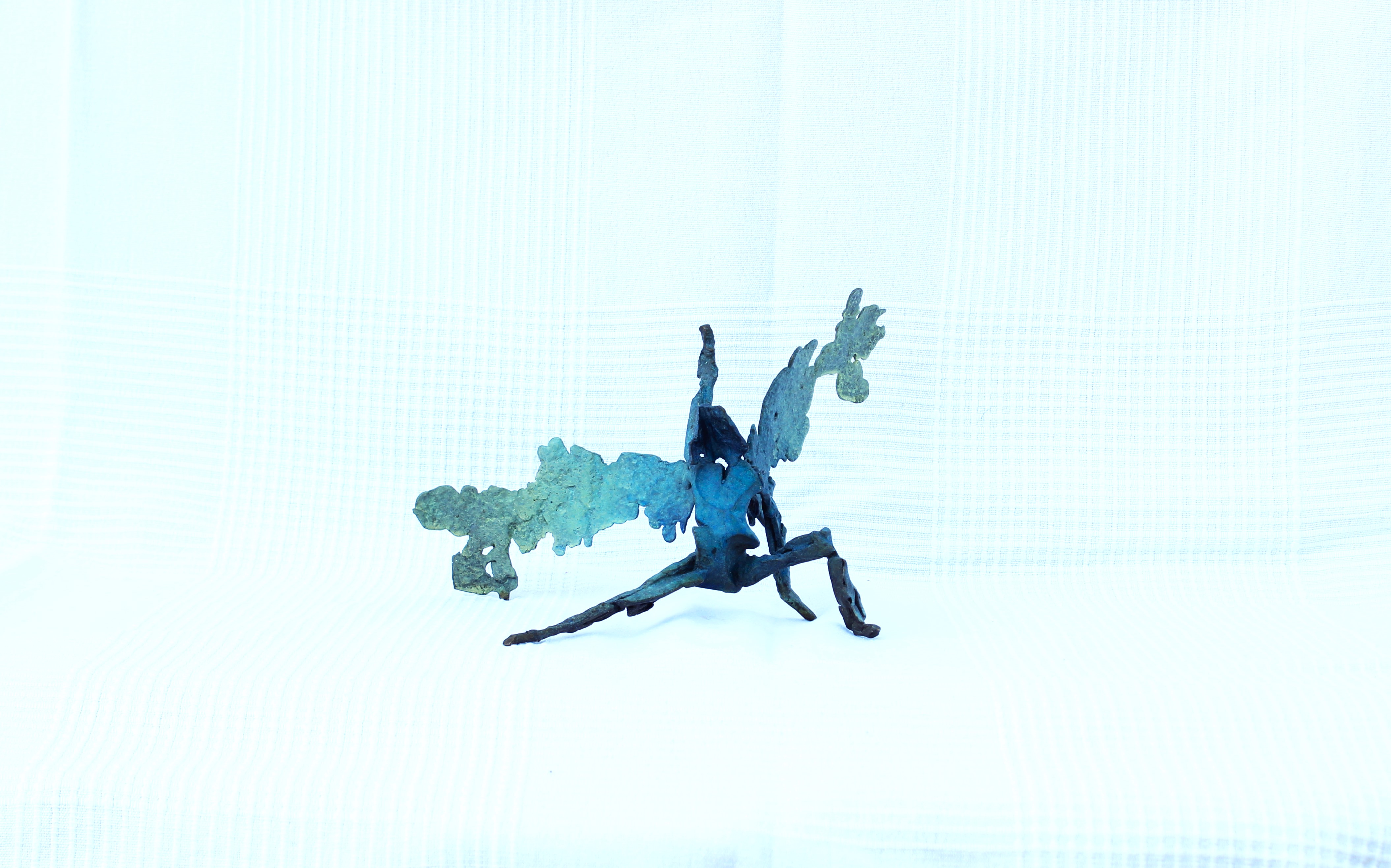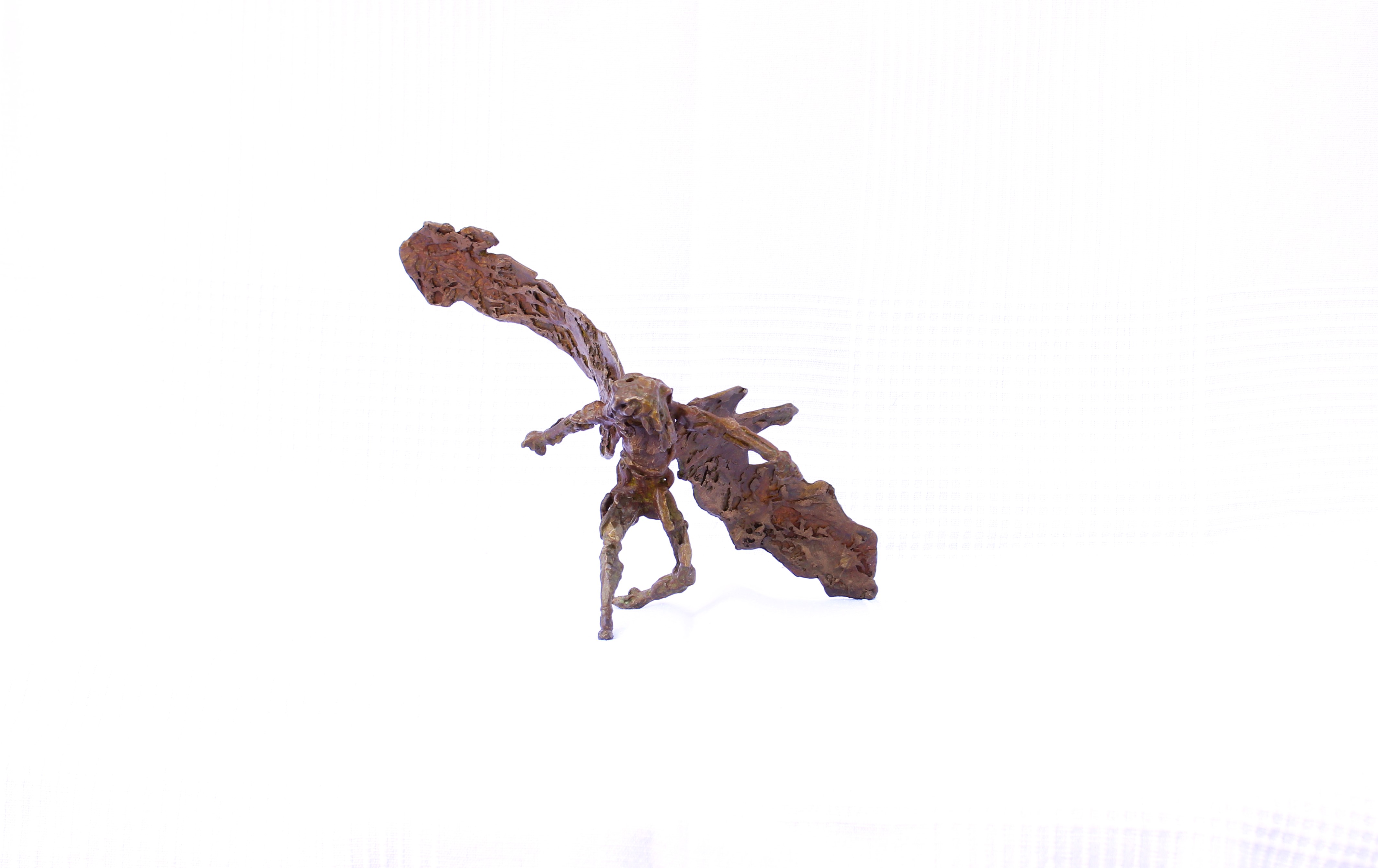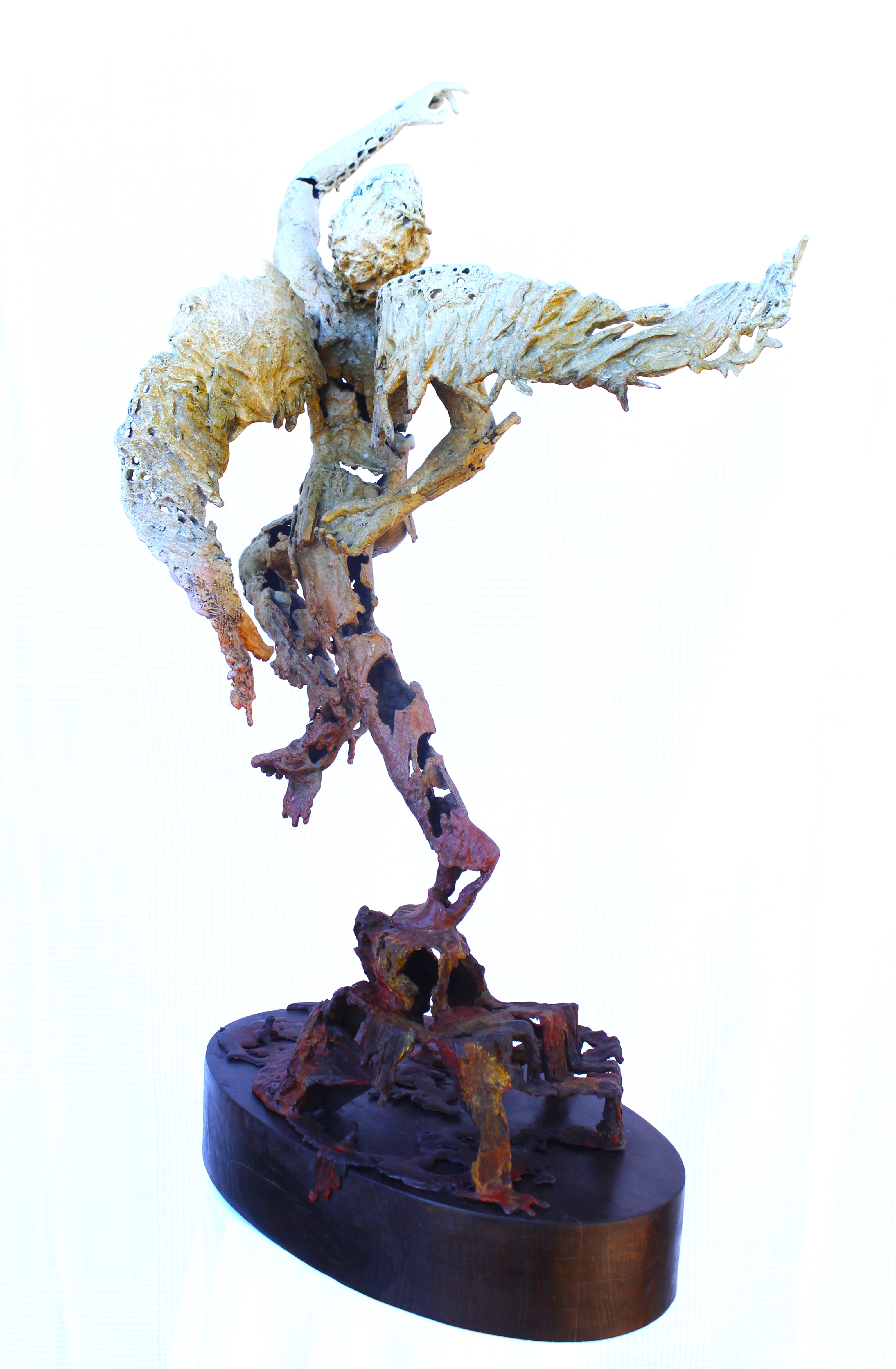 hacia el firmamento que indica todo lo contrario, deseo de libertad. La composición y dinamismo de las extremidades, la colocación de las alas, así como los colores empleados en la pátina, sugieren la elevación y ascensión de la figura desde el infierno hacia el cielo, en forma de ángel, y simboliza la remisión del Mal frente al triunfo del Bien.